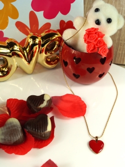 Boucles d'oreilles en acier inoxydable doré composées d'un crochet d'oreille orné d'une perle de verre facetté rouge, d'une petite breloque cœur dorée, d'un pendentif filigrane en forme de rose et d'un gros sequin cœur émaillé rouge pomme d'amour.