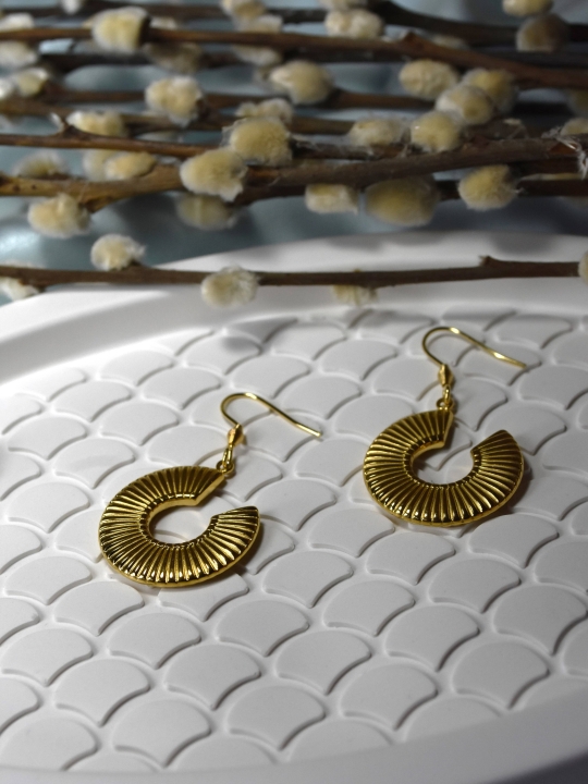 Boucles d'oreilles en acier inoxydable doré composées d'un crochet d'oreille assorti d'une créole plate ouverte ayant un motif rayé.