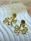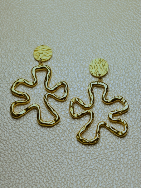 Boucles d'oreilles en acier inoxydable doré composées d'une attache puce ronde martelée d'un diamètre de 12 mm et d'un pendentif en forme de grosse fleur irrégulière, découpé façon puzzle.