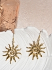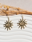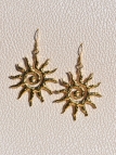 Boucles d'oreilles en acier inoxydable doré composées d'une attache crochet et d'un pendentif soleil aux rayons ondulés formant un tourbillon en son centre.