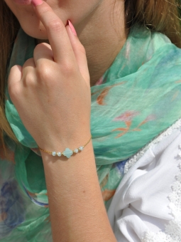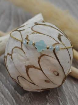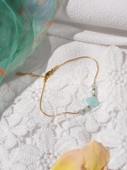 Bracelet en acier inoxydable doré composé d'une chaîne très fine ornée de petites perles de verre facettées vert d'eau.