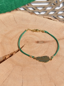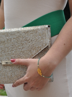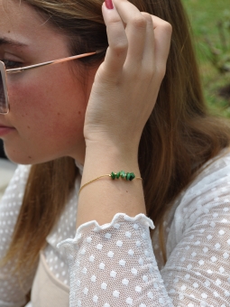 Bracelet en acier inoxydable doré orné de breloques de perles de verre et de pampilles en forme de feuille ajourée.