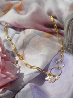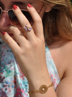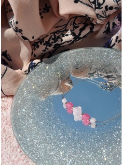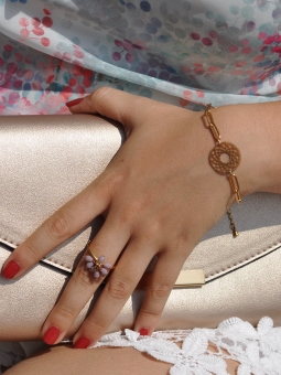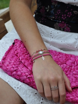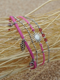 Bracelet multirangs mêlant breloques, perles de verre, suédine et coton fuchsia