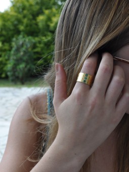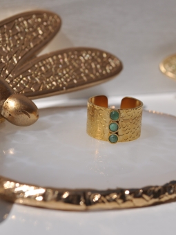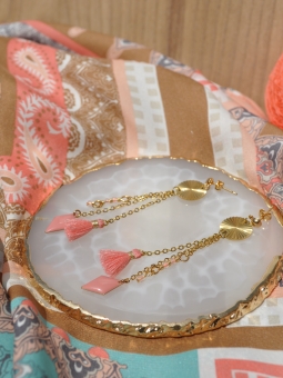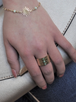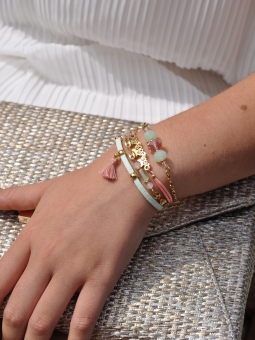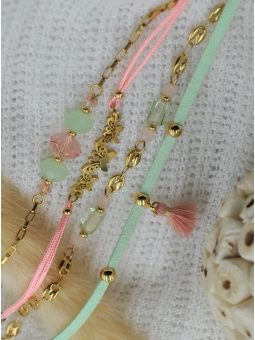 Bracelet multirangs mêlant perles de verre, suédine et coton vert d'eau et saumon