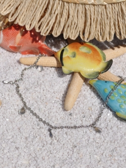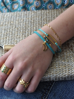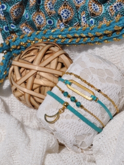 Bracelet multirangs mêlant perles de verre, suédine et coton bleu canard