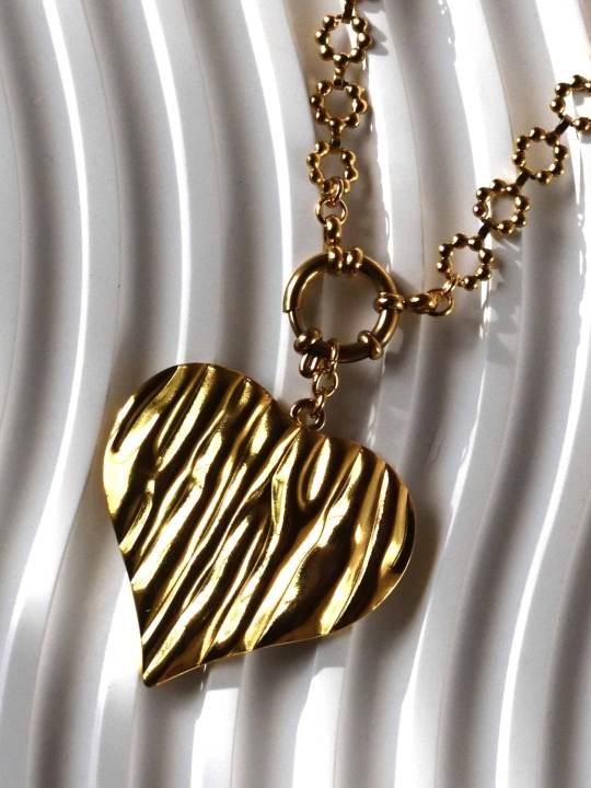 Collier en acier inoxydable doré composé d'une chaîne fantaisie à maillons cerclés, d'un gros fermoir bouée et d'un large pendentif cœur effet plissé.